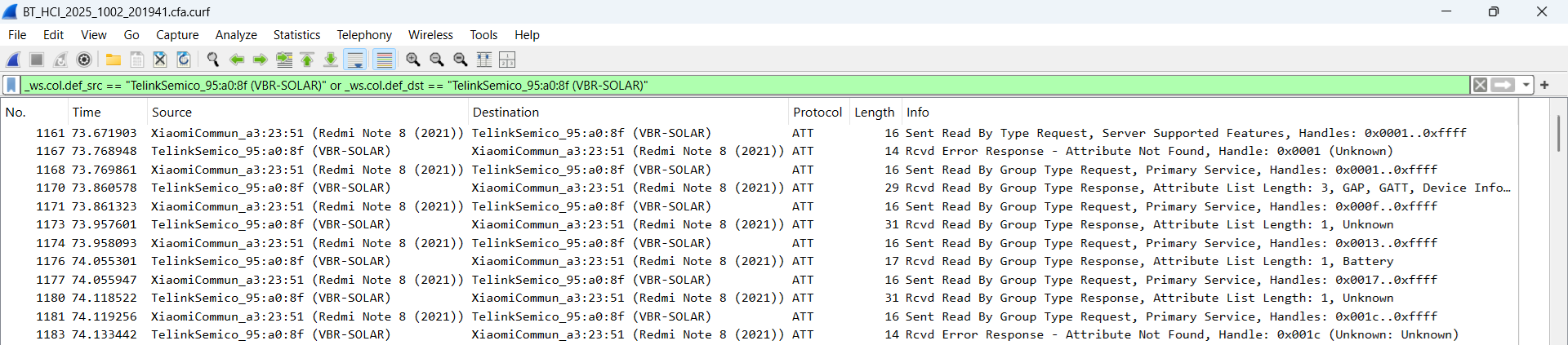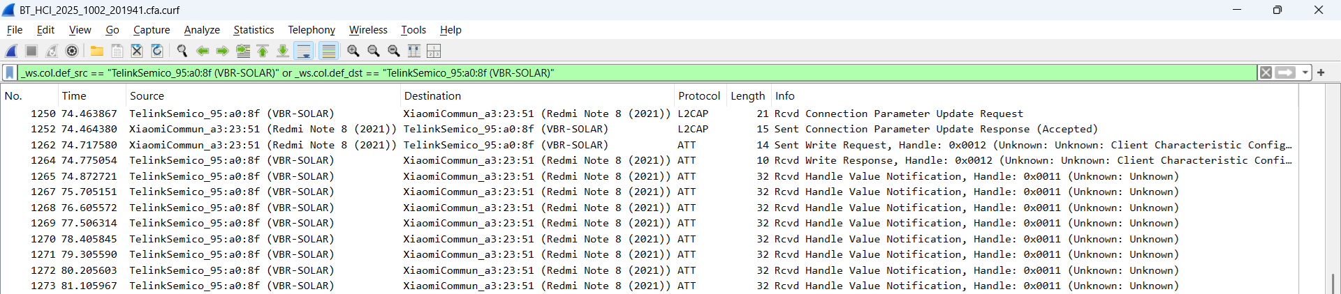 Il video della sessione di misura è stato utile per ricostruire la sequenza di valori visualizzati dall'app con le relative tempistiche. Per lo scaricamento della cattura del traffico Bluetooth ho proceduto così: